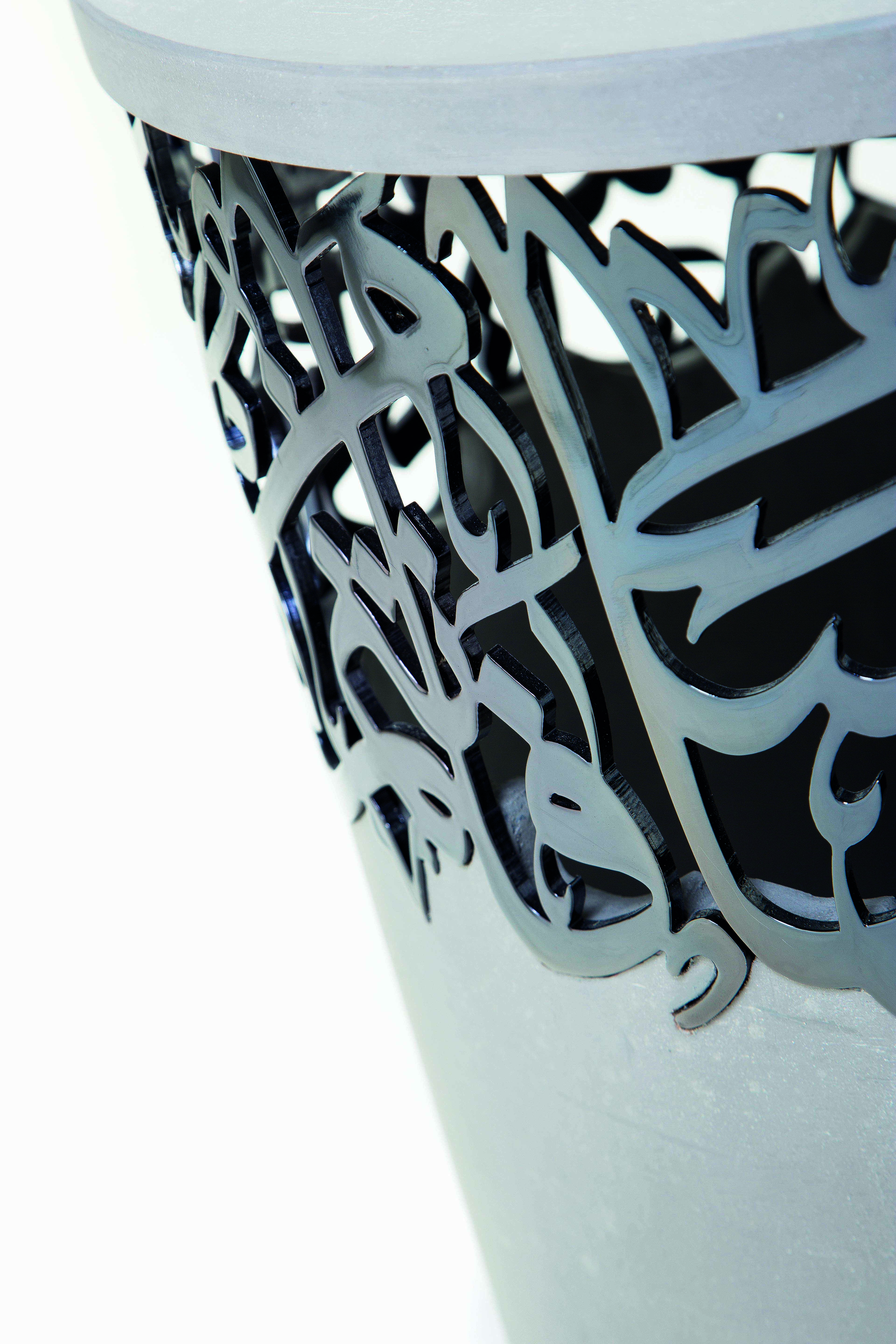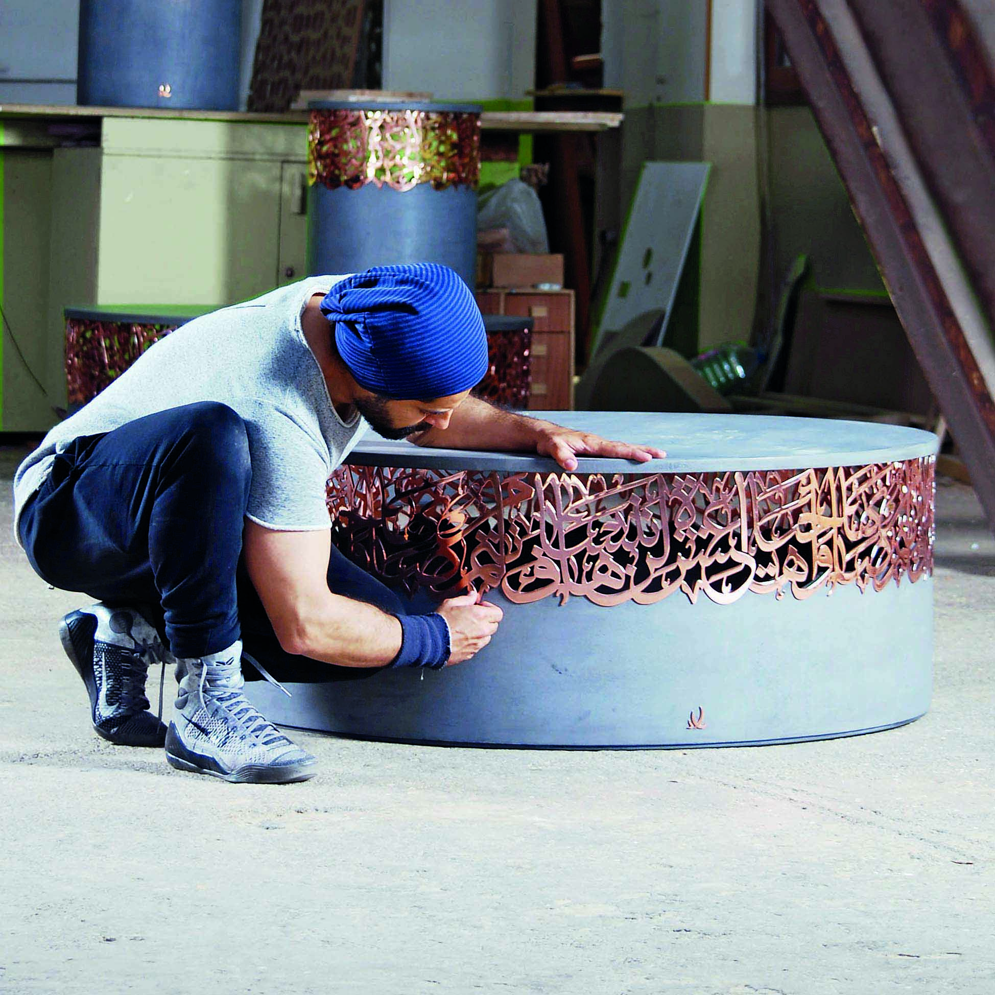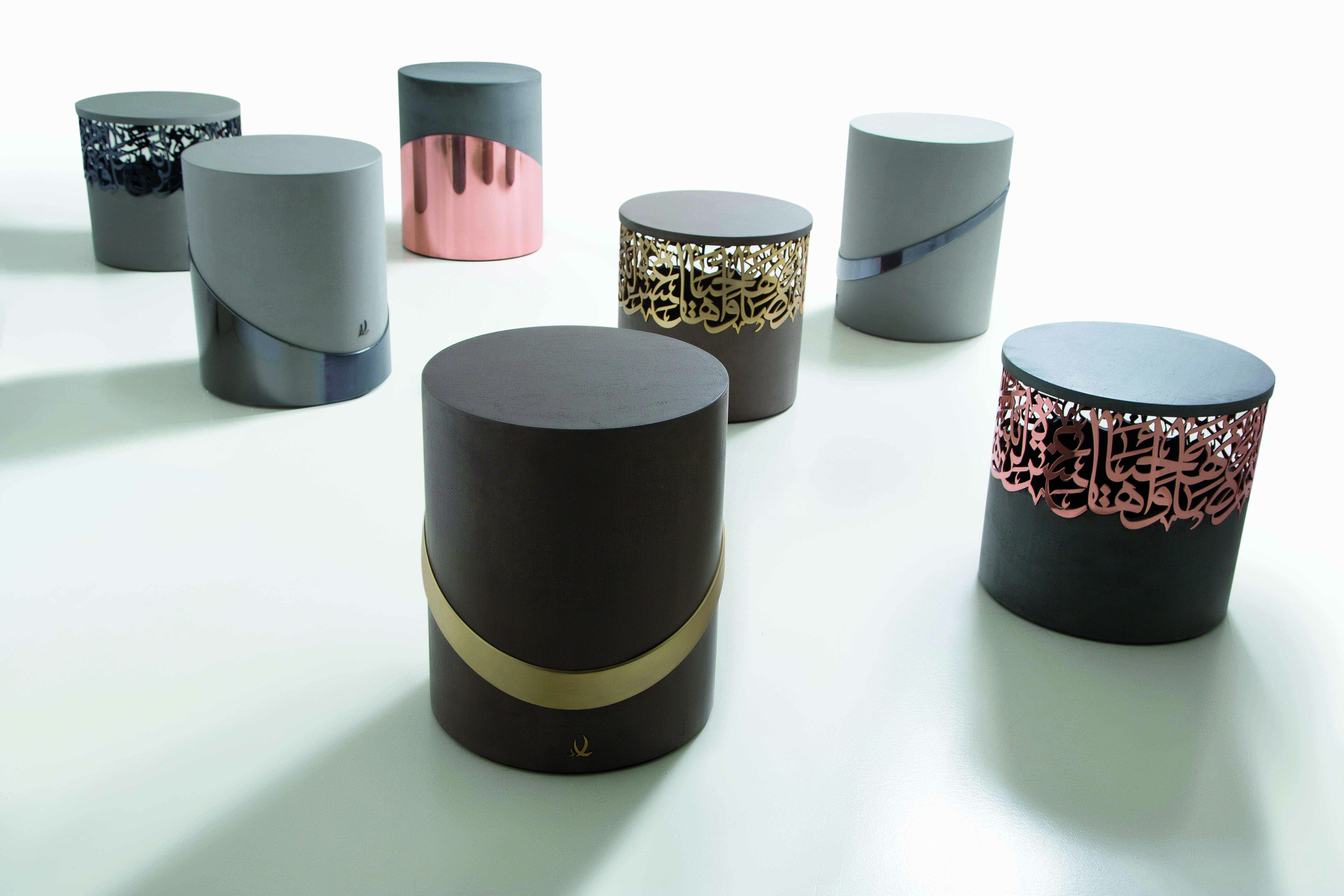Naja says that much of his influence is drawn from the rich well of Arab history, and his goal is to show this to the rest of the world by making it relevant in a modern context. His art reflects his surroundings, for example some of his calligraphy and his collection of stools are made from concrete and steel, inspired by the construction industry and the ever-changing face of a city. “You do not have to use beautiful materials to produce a beautiful object,” notes the artist, “there’s something about using metal that I find so rewarding. That this hard, rough substance can be melted down and turned into something beautiful and tough is amazing.”