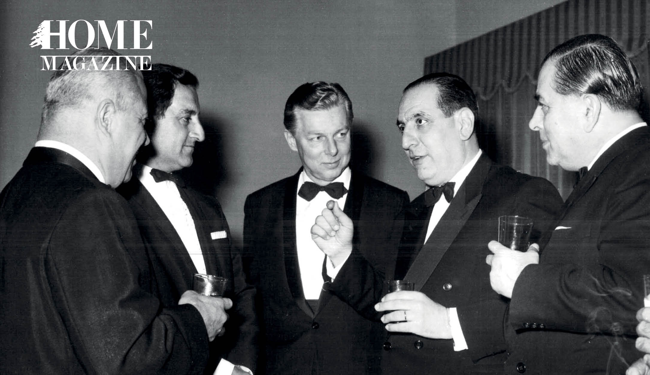 At a reception in honor of Danny Thomas. From left to right: MP Emile Boustani, Danny Thomas, U.S. Ambassador HE Armin H. Meyer, Charles Helou (Lebanon’s next president), and Lebanese ambassador to the United States Ibrahim Al-Andab