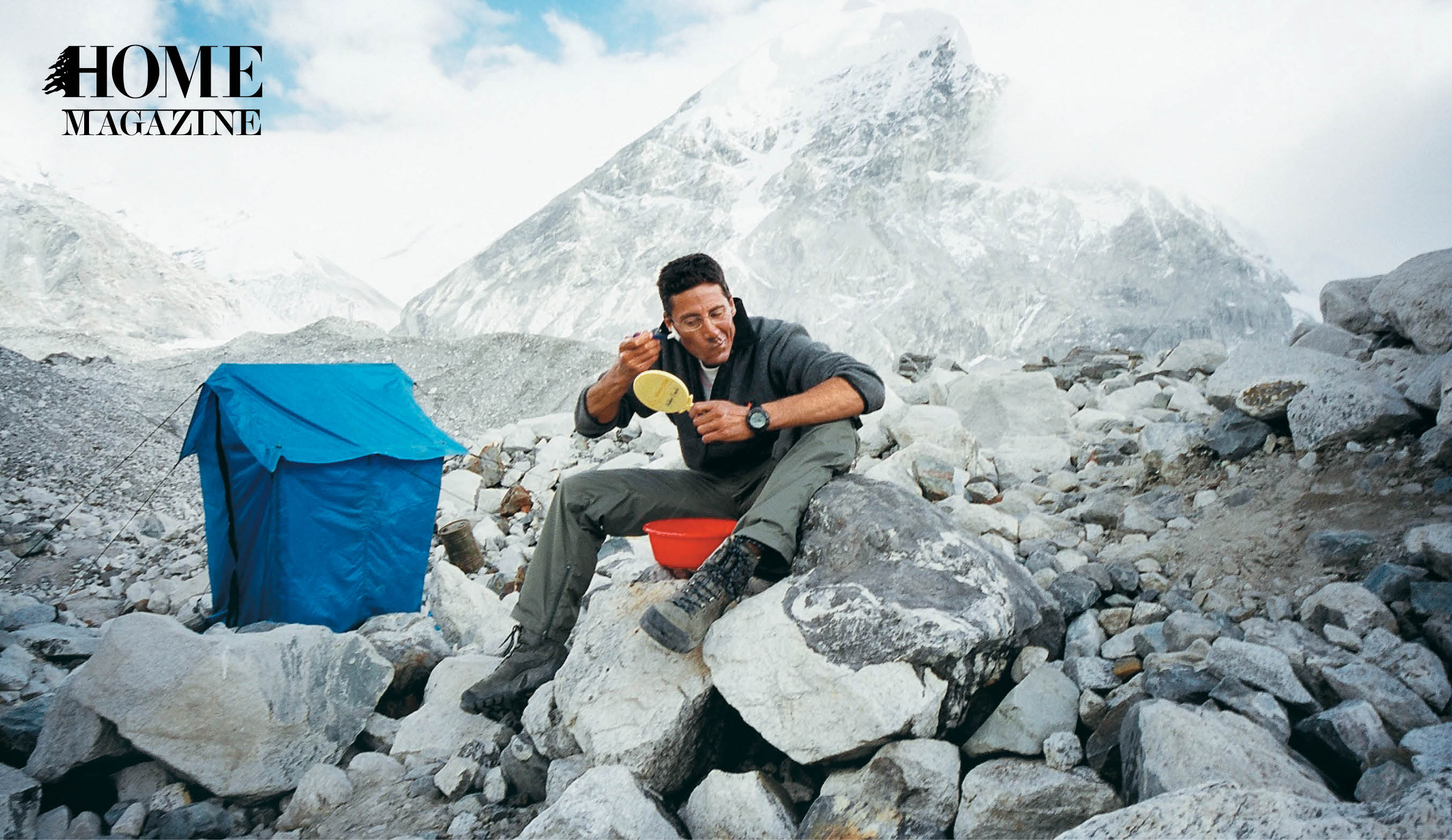 A forest of pine trees encircles Baabdat, his residence in Mount Lebanon. Our host warmly welcomes us into his HOME around noon, having just spent the morning skiing the surrounding mountains— mind you, no ski lifts in sight. Behind him is a string of colorful prayer flags, the type typically tied at Everest Base Camp for good luck. A flood of natural light seeps into his living room, complementing Chaya’s infectiously bright outlook on life. The space also showcases his love of mountaineering. Oil paintings of summits adorn his walls, and a copy of his autobiographical book, Steep Dreams: My Journey to the Top of the World, sits on his coffee table.