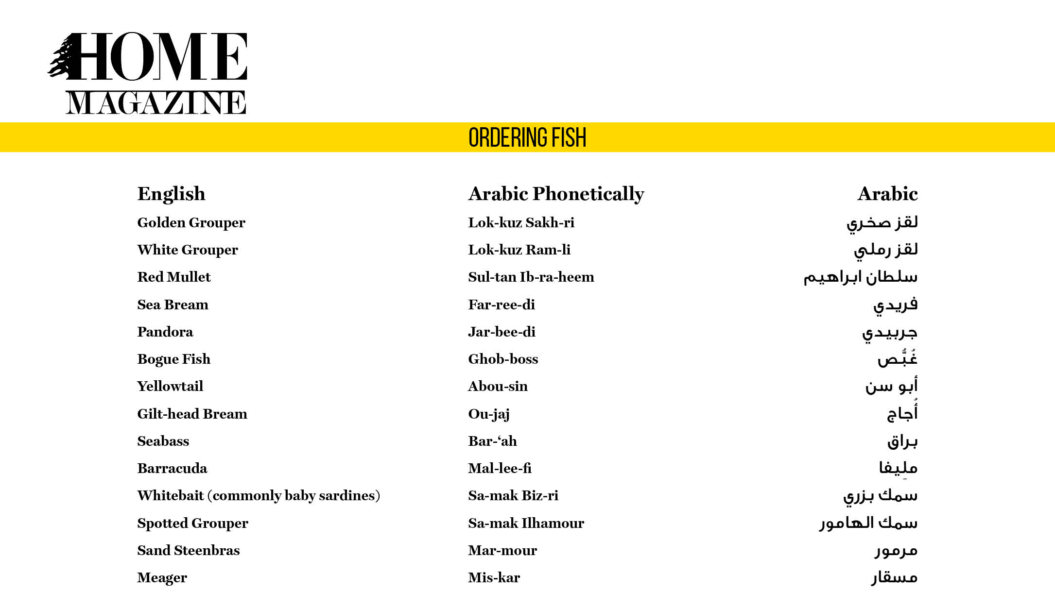 Translating the names of fish was surprisingly complicated, although we consulted several dictionaries, online and famous chefs. That’s because the names differ from one Arab country to another. We are building a list of names commonly used in Lebanon. We welcome your input to expand this table.