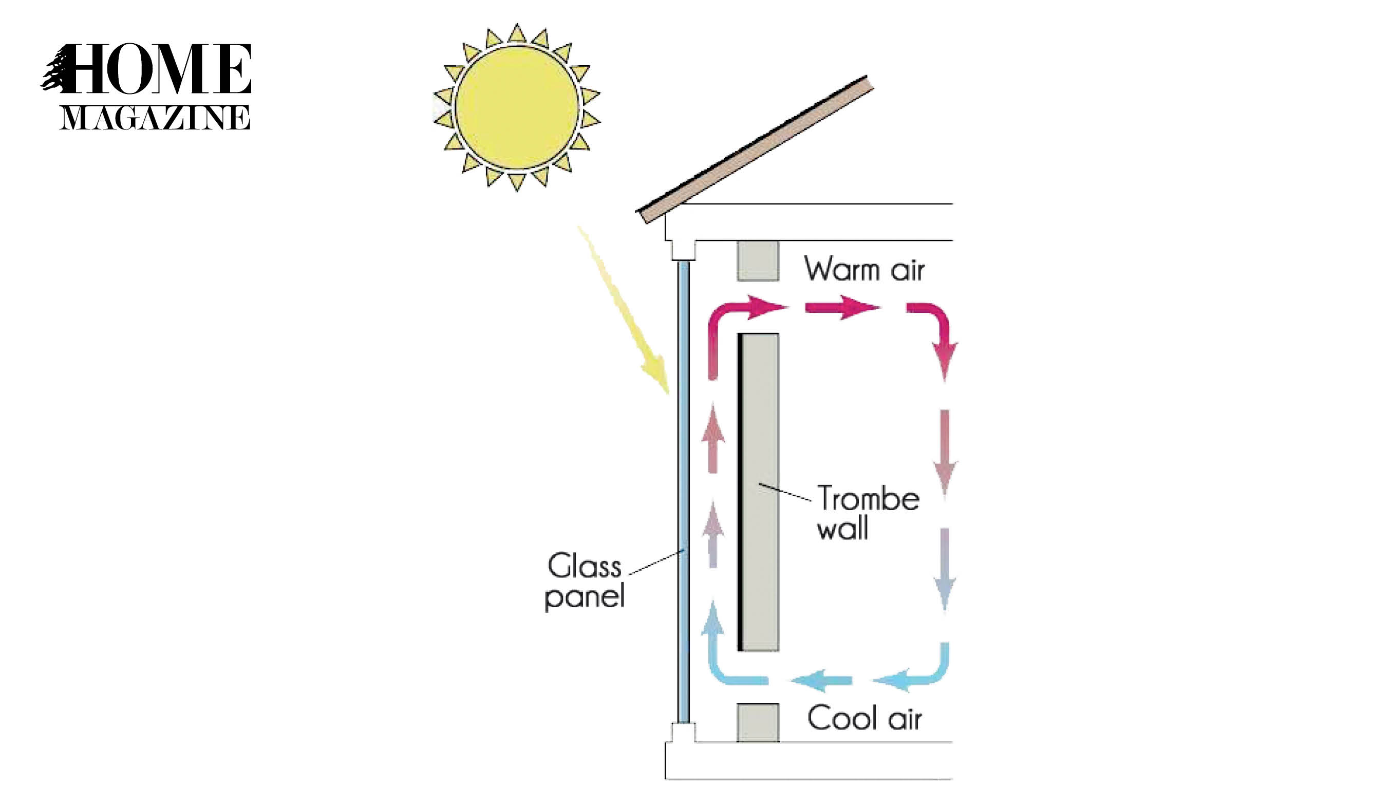 The gap between the wall and glass will contain trapped air if the structure is well sealed. In fact, such a structure resembles a closed solar air heater that is placed vertically (see figure). Thus, the sun’s rays pass through the glass, heat is absorbed in the dark wall and is passed through the wall to the interior at a pace that depends on how thick the wall is. The wall tends to store heat some time beyond sundown.