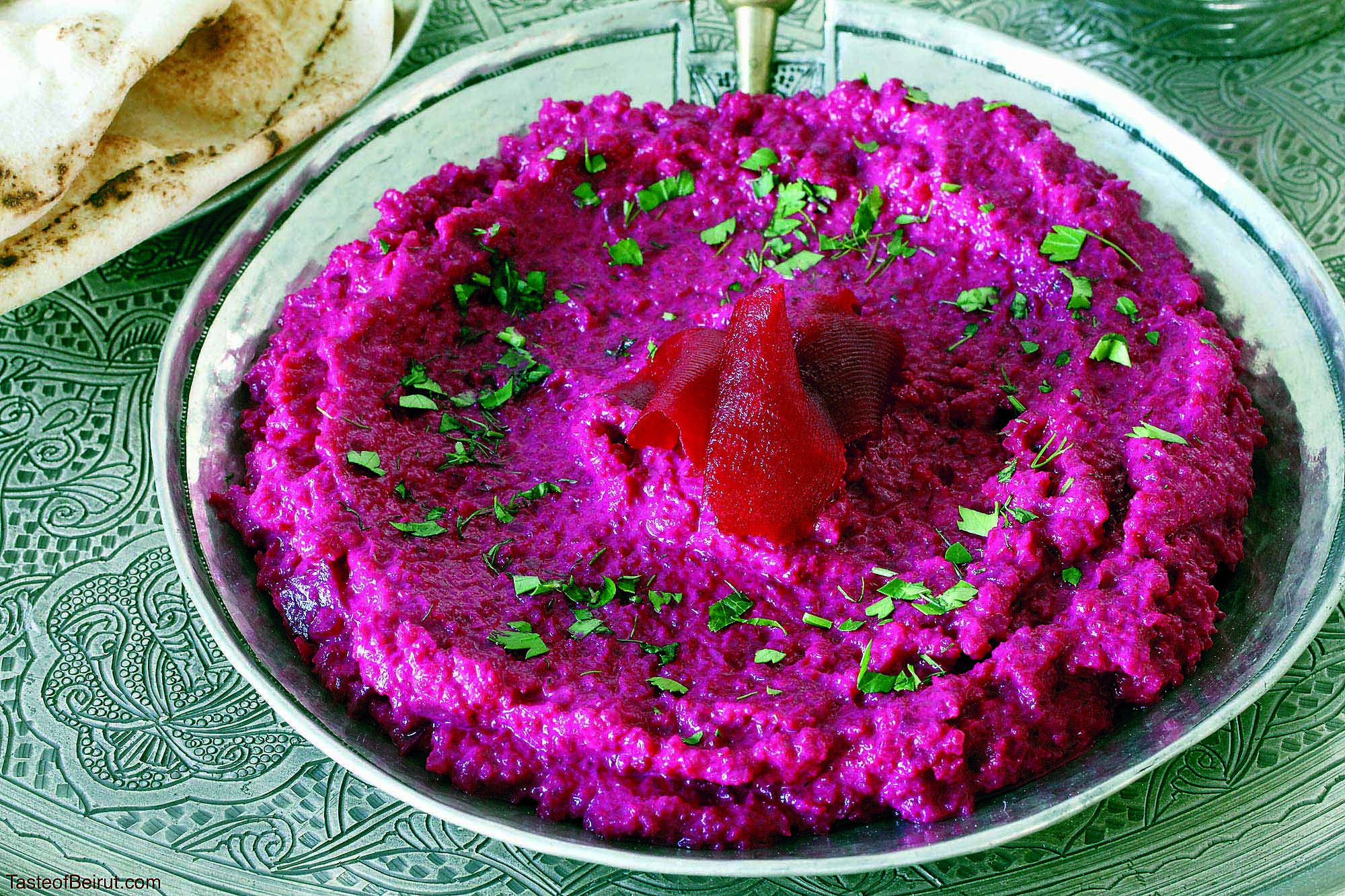 Roast the beets in a 350F oven for 45 minutes or until tender. Peel and cut into chunks; mash in a processor with the juice of a lemon, garlic and tahini; taste and adjust seasoning, adding more lemon or tahini or garlic. Garnish with the pomegranate arils if desired and serve at room temperature with pita bread or chips.