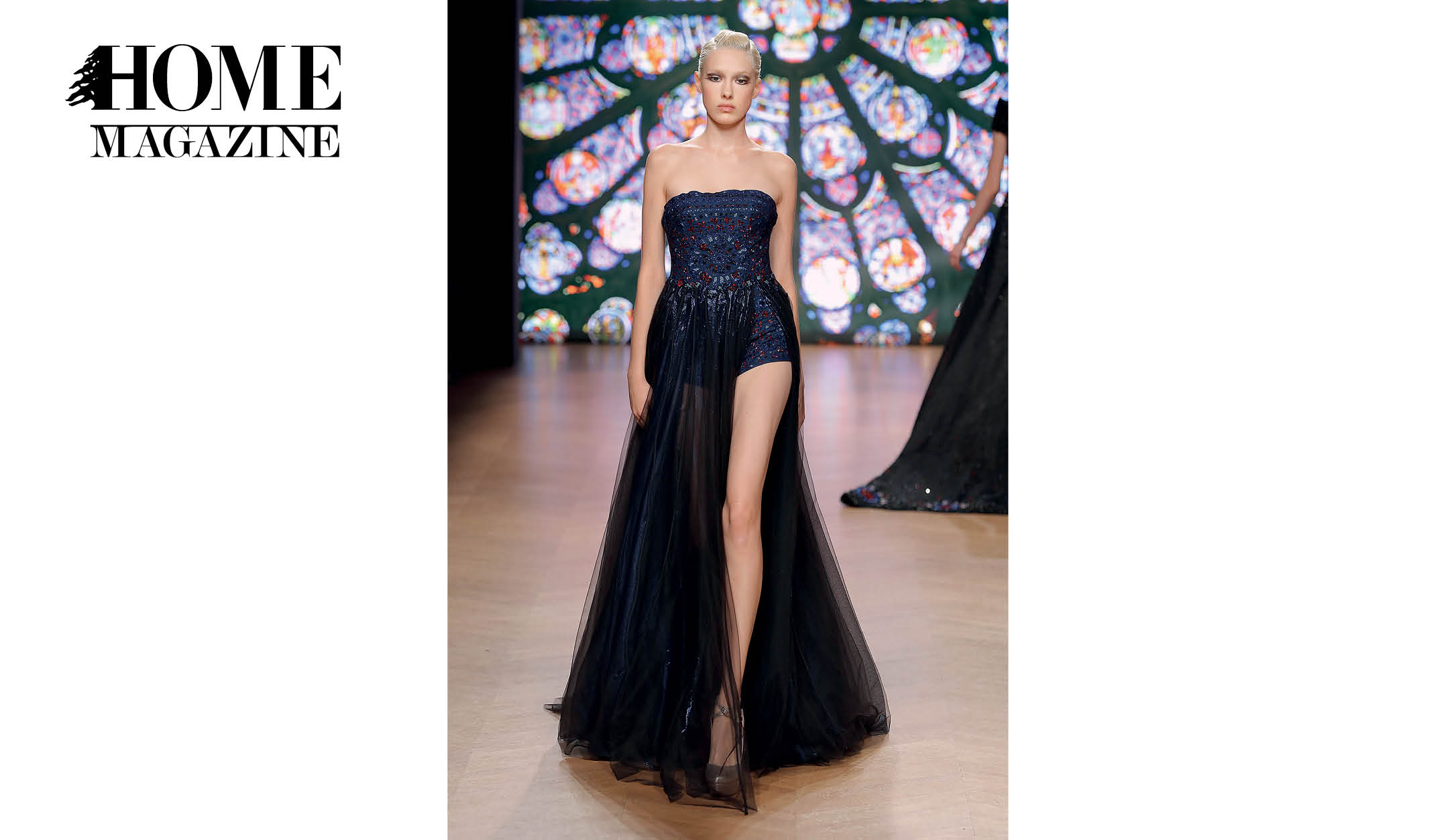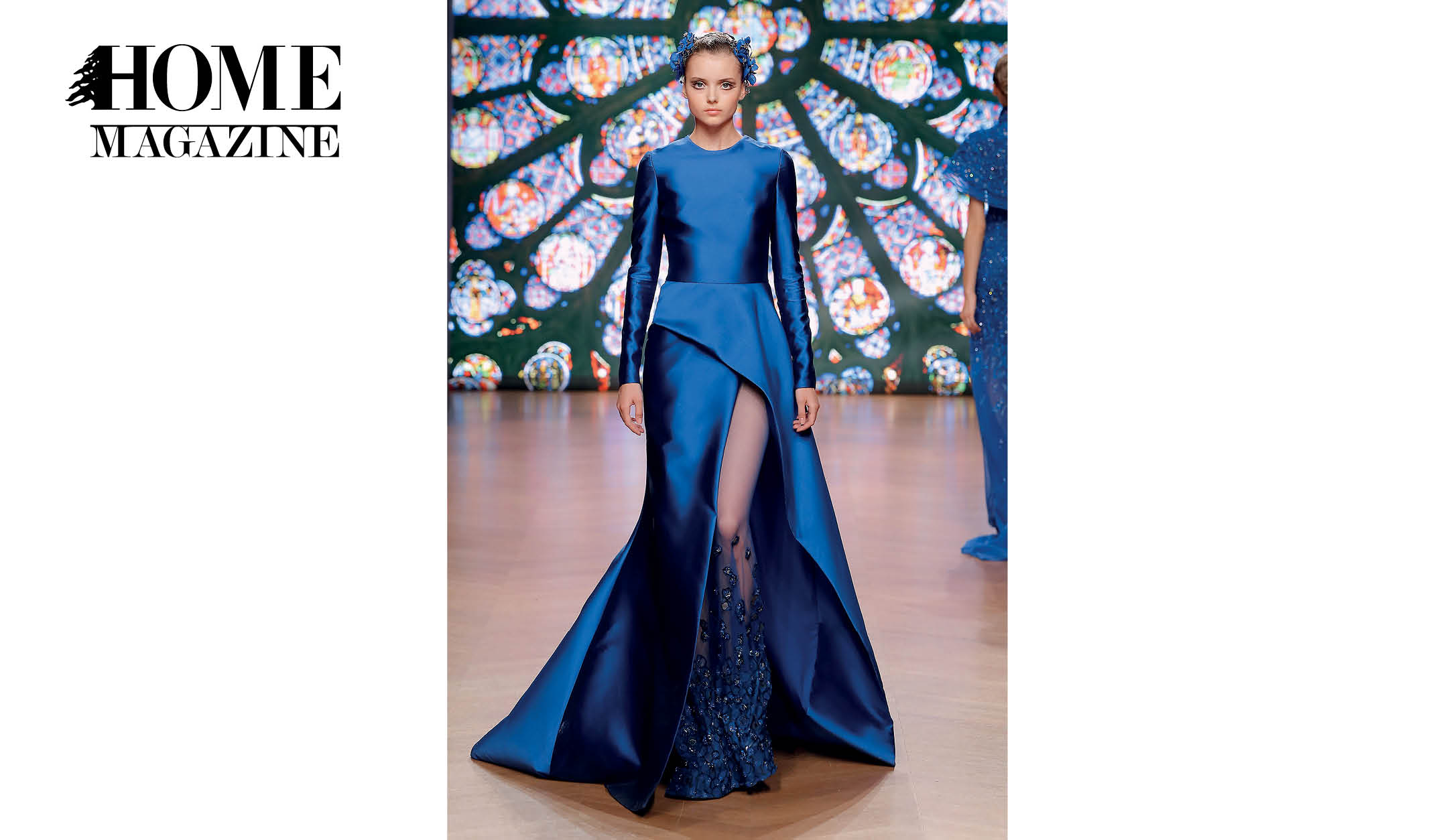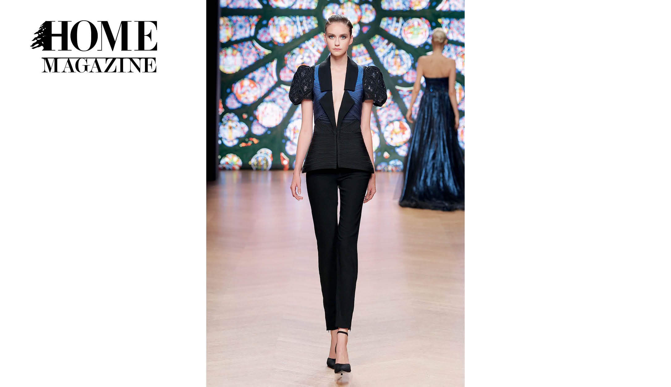 The designer explored new and unusual ways of folding, weaving and mixing fabrics such as lace, silk crepe, printed transparent screens and embroidered tulle. The color palette is rich, following the enchanting array of vivid colors of stained glass windows when illuminated by the sun; powder blue, gitane blue, red, gold, white and black.
