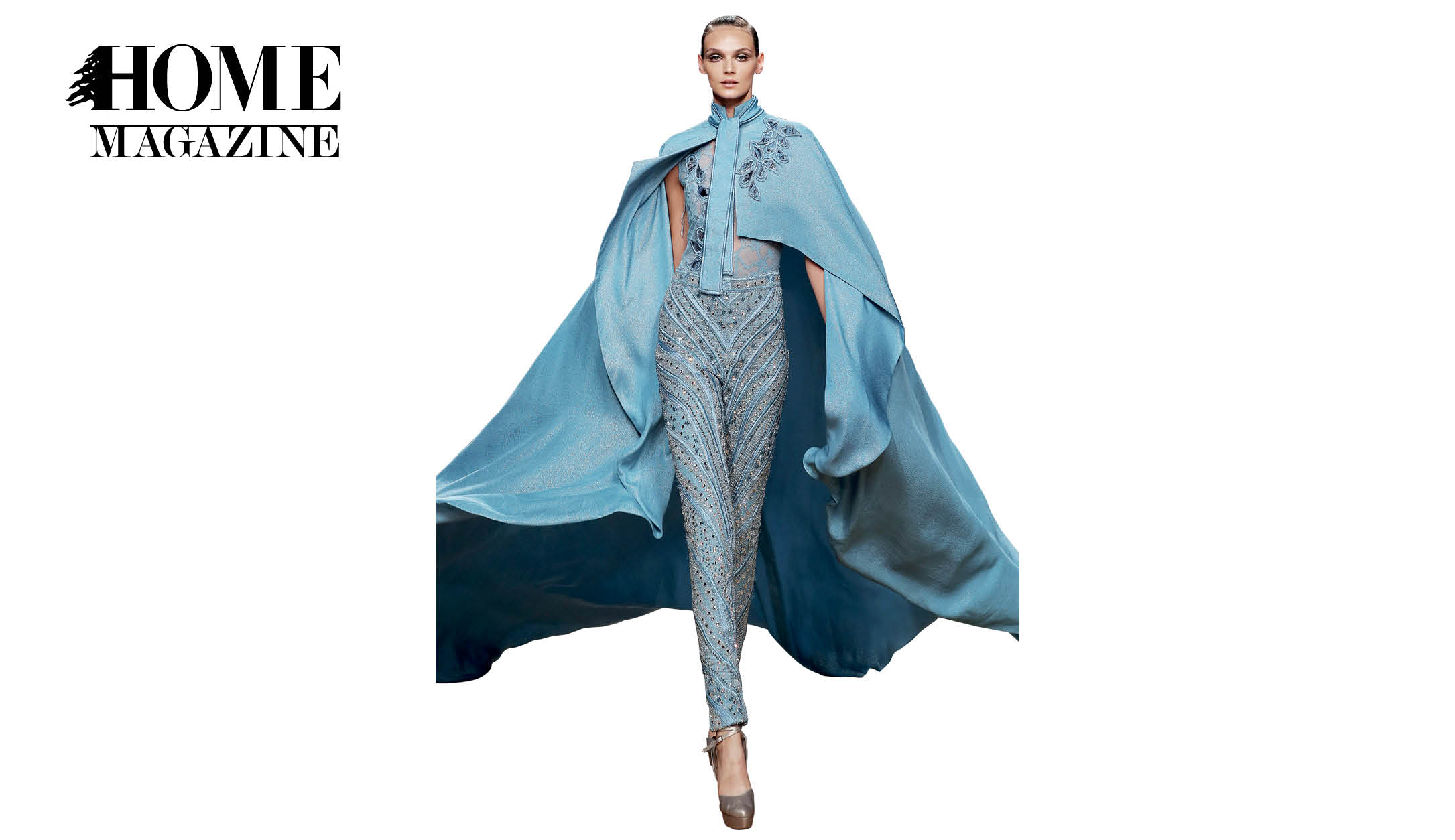 The designer explored new and unusual ways of folding, weaving and mixing fabrics such as lace, silk crepe, printed transparent screens and embroidered tulle. The color palette is rich, following the enchanting array of vivid colors of stained glass windows when illuminated by the sun; powder blue, gitane blue, red, gold, white and black.